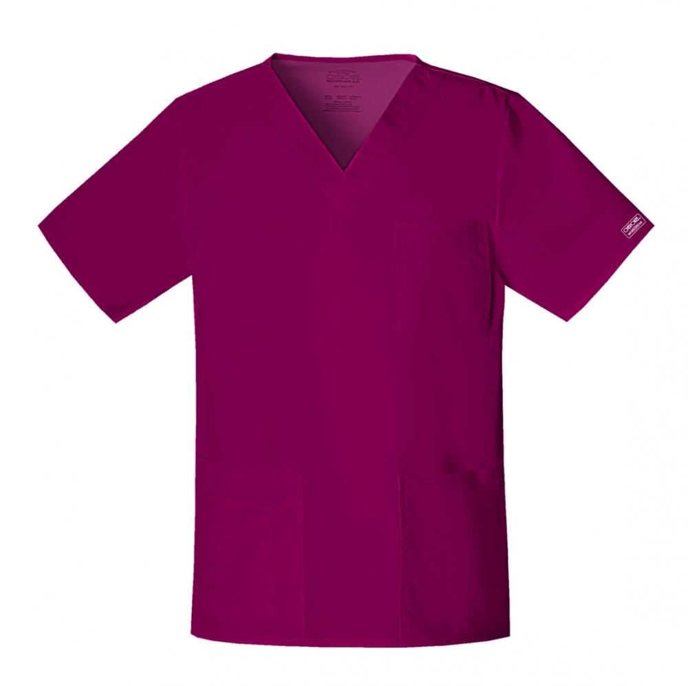 A Unisex V-neck features double needle stitching. The chest pocket features an instrument holder. Also included are two patch pockets, an additional instrument/cell phone pocket on right side, back yoke and side vents. Center back length: 28"