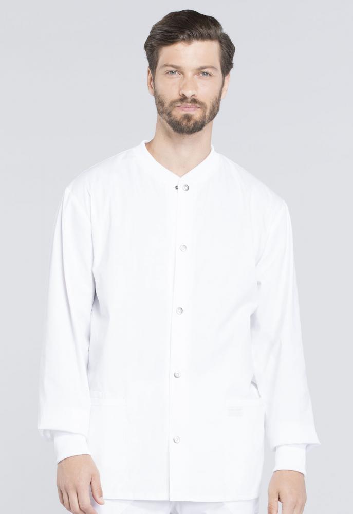A Men's snap front jacket features a comfortable rib-knit collar and cuffs, two patch pockets, a cellphone pocket, and back yoke. Center back length: 30"