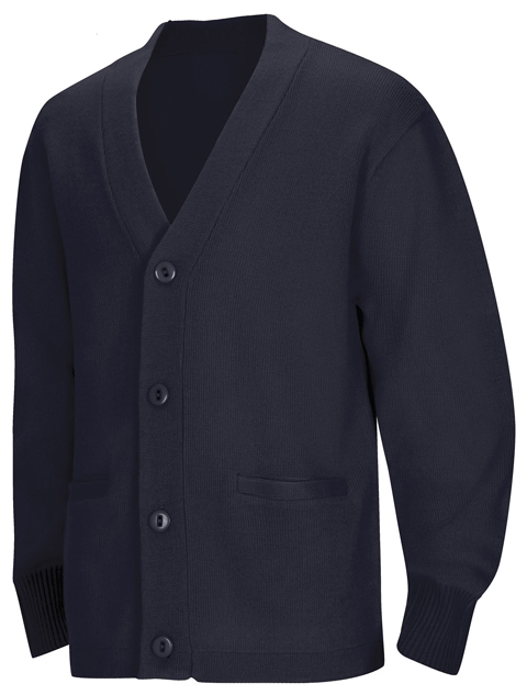 Adult Unisex Cardigan Sweater, 100% Acrylic flat knit has 5 button placket and two functional welt pockets.
