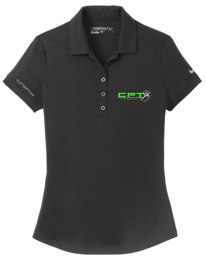 This polo delivers timeless style and performance with ultra-smooth double pique and Dri-FIT moisture management technology. Design features include a streamlined self-fabric collar and open hem sleeves. Tailored for a feminine fit with a five-button placket. A heat transfer contrast metallic silver Swoosh design trademark is on the left sleeve. Made of 6-ounce, 100% polyester Dri-FIT fabric.