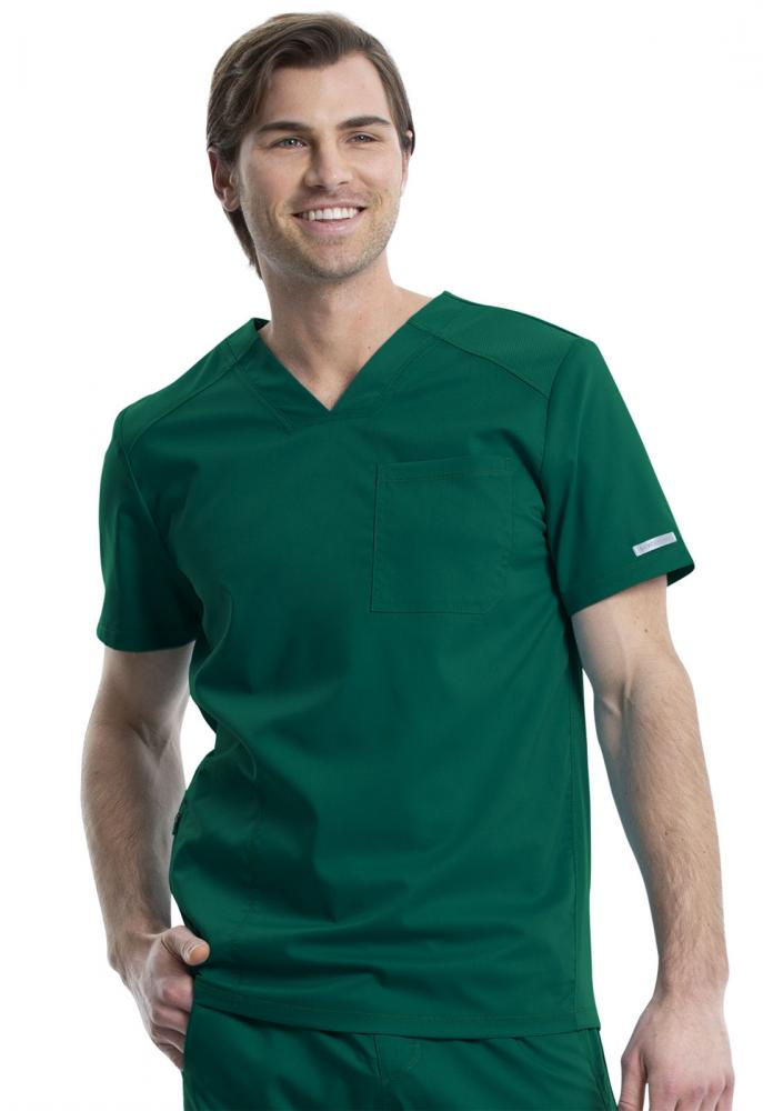 This stylish Men's V-neck top features a breathable mesh at the side seam panels, front and back shoulder panels for extra comfort and mobility. This top also features one front chest pocket, one front mobile pocket with a security zipper finished with reflective instrument loop. Center back length: 28 1/2"Collection : WW Revolution