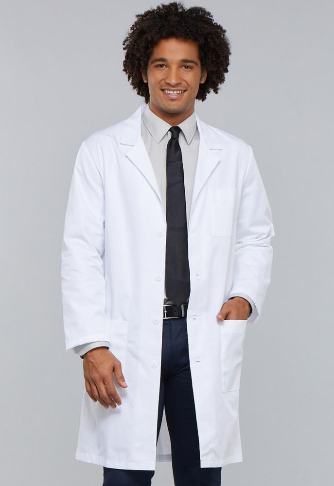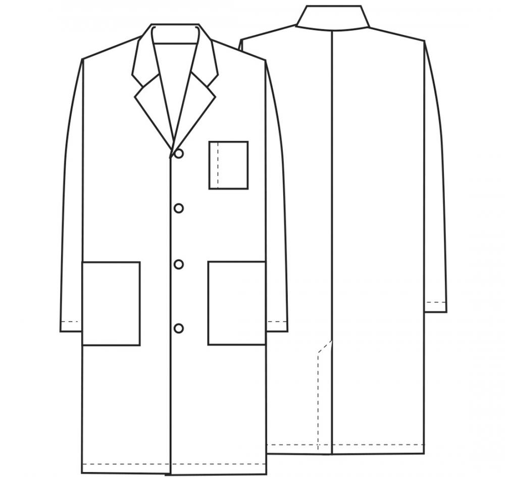 A Unisex lab coat has side access openings, two roomy patch pockets, a chest pocket with a pencil stitch, and vented back. Center back length: 40"