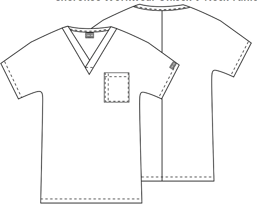A dolman sleeve, V-neck Unisex tunic has a chest pocket with a pencil slot. Center back length 27.5".