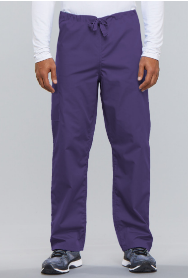 A casual Unisex Traditional fit pant features a natural rise and an adjustable webbed drawstring at the waist, one back pocket, and a cargo pocket with an inside cell phone pocket. Inseam 31".