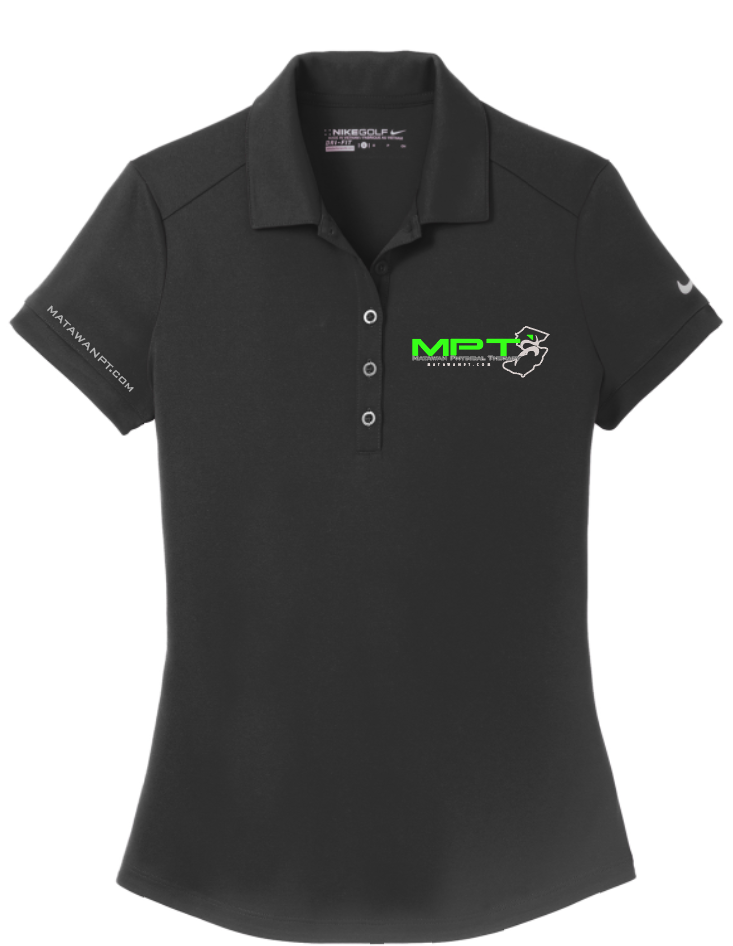 This polo delivers timeless style and performance with ultra-smooth double pique and Dri-FIT moisture management technology. Design features include a streamlined self-fabric collar and open hem sleeves. Tailored for a feminine fit with a five-button placket. A heat transfer contrast metallic silver Swoosh design trademark is on the left sleeve. Made of 6-ounce, 100% polyester Dri-FIT fabric.