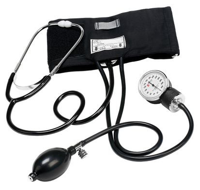 A convenient home blood pressure set that features a D-Ring for easy self-fastening and an attached single head stethoscope.
