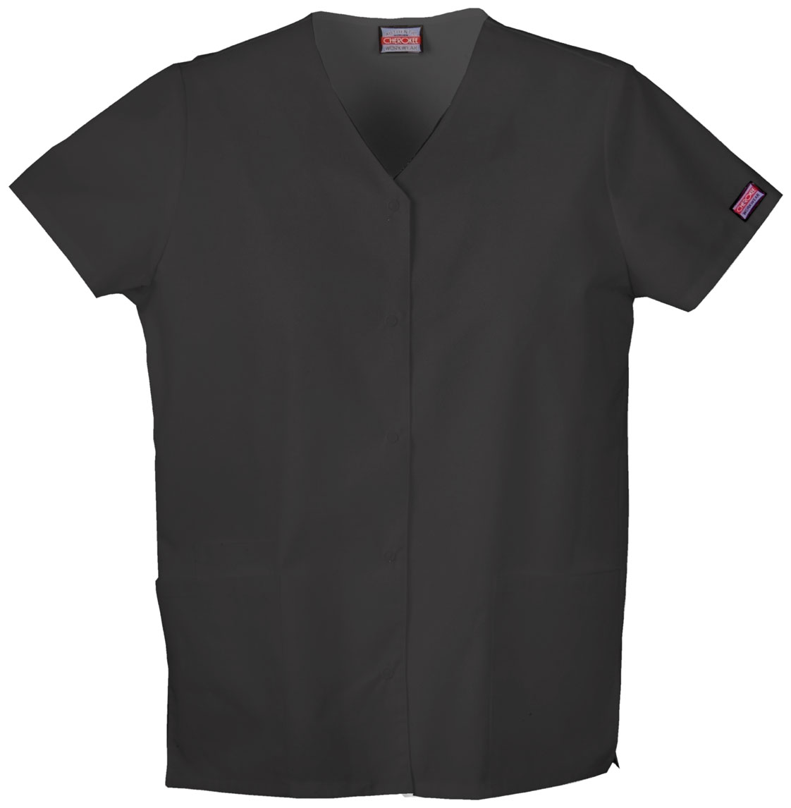 This short sleeve, snap front top has two patch pockets, a cell phone pocket and side vents. Center back length 26.5".