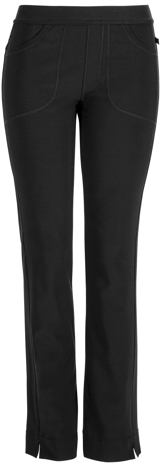 A low-rise, slim pant features a soft elastic waistband, front curved pockets and a mock fly. Also featured is a back yoke in stretch rib for added comfort, two back pockets and side vents. Cover-stitch detail throughout. Inseam length: 31"
