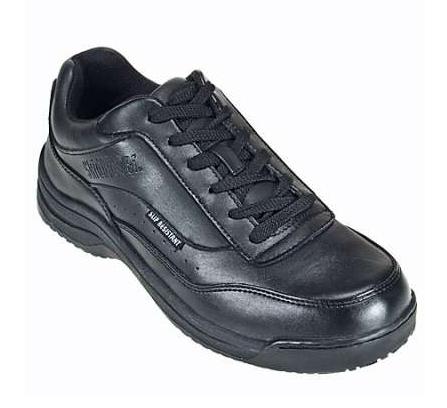 The sporty styling and practical features of these athletic-inspired black Slip-Resistant Work Shoes from Skidbuster make them a great choice for a variety of slippery worksites from restaurants to hospitals. They feature supple action leather uppers and an easy-wearing, lace-up design. Strobel construction makes them supremely flexible for comfortable wear during those long, double shifts. Of course, their crowning glory is found underfoot in the form of grippy slip-resistant outsoles. Whether you face the food-ridden floors of a restaurant or the slippery surfaces of a hospital, you won?t have to worry about staying vertical in this pair.