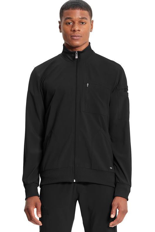 A Men's Modern fit zip front jacket features back side panels, collar, cuffs and waistband made with a stretch rib knit for extra comfort. Also featured are a logo zipper pull, front chest pocket with security zip closure, patch pockets, and an instrument loop and sectional pocket on the left sleeve. Center back length: 28" . The comfortable stretch poplin fabric and super stretchy rib knit is the perfect combo for healthcare professionals.Collection : Infinity