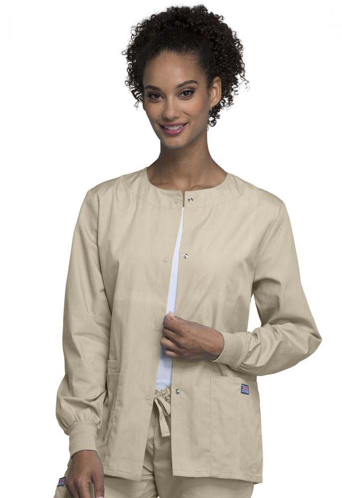 A Traditional Classic fit, round neck snap front warm-up with two patch pockets, knit cuffs, and a cell phone pocket. Center back length: 27 1/2".