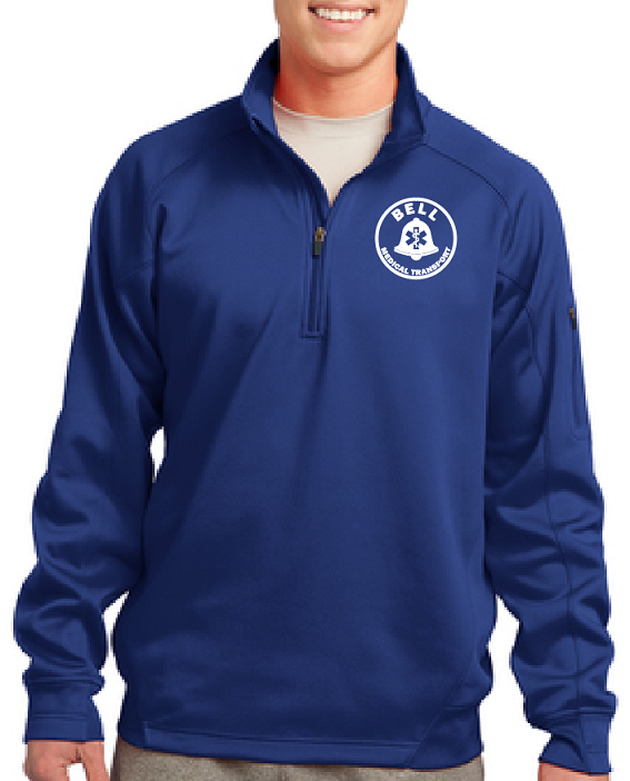 Cool, dry and colorfast, this quarter-zip pullover has a pill-resistant, snag-resistant face with a matte finish and brushed backing for comfort. It features double-knit construction, as well as a zippered pocket on the left sleeve and a chin guard.