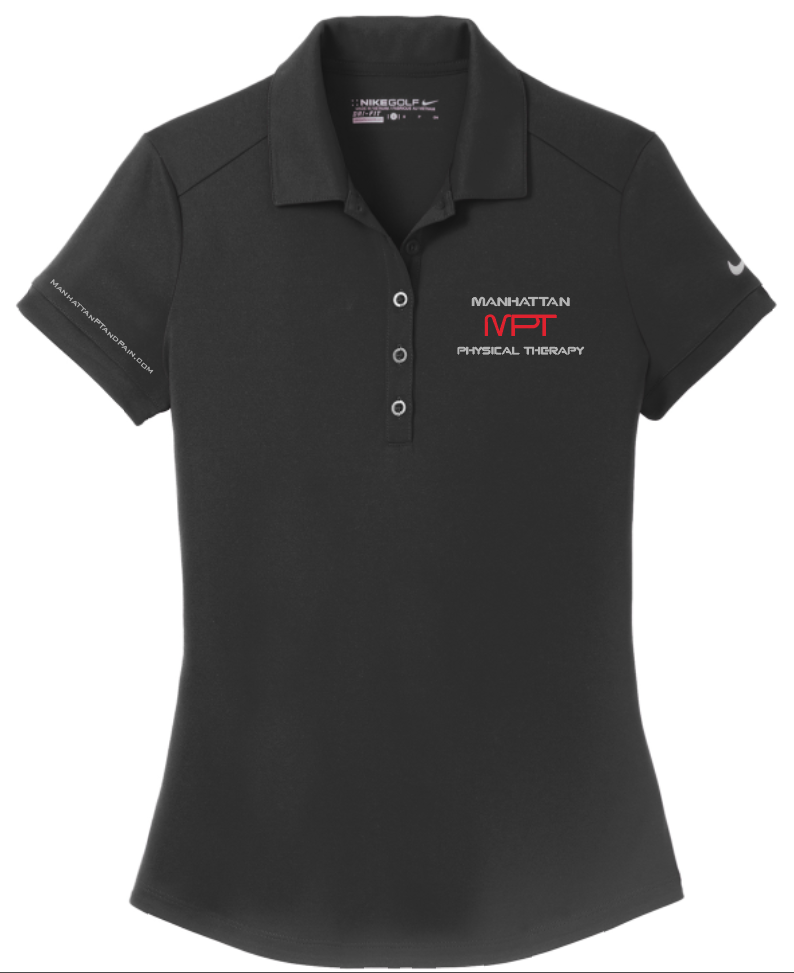 This polo delivers timeless style and performance with ultra-smooth double pique and Dri-FIT moisture management technology. Design features include a streamlined self-fabric collar and open hem sleeves. Tailored for a feminine fit with a five-button placket. A heat transfer contrast metallic silver Swoosh design trademark is on the left sleeve. Made of 6-ounce, 100% polyester Dri-FIT fabric.
